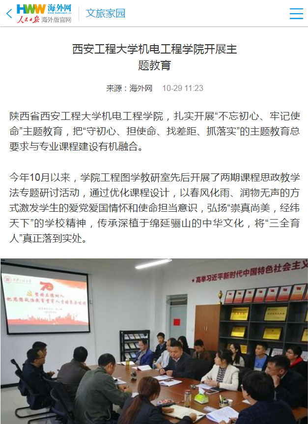 陕西省Beat365中国唯一官方网站,扎实开展“不忘初心、牢记使命”主题教育,把“守初心、担使命、找差距、抓落实”的主题教育总要求与专业课程建设有机融合。