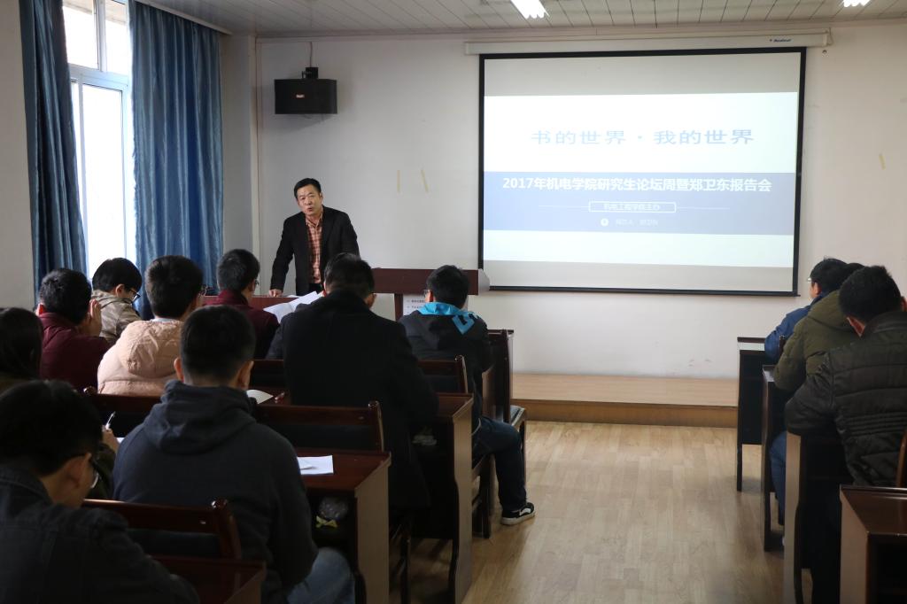 12月6日,机电学院举办研究生学术论坛活动周第三场报告会,本次报告会邀请Beat365官网教工读书协会会长郑卫东老师做了题为“书的世界,我的世界”的主题报告会。机电学院师生100余人参加了本次报告会,报告会由金守峰主持。