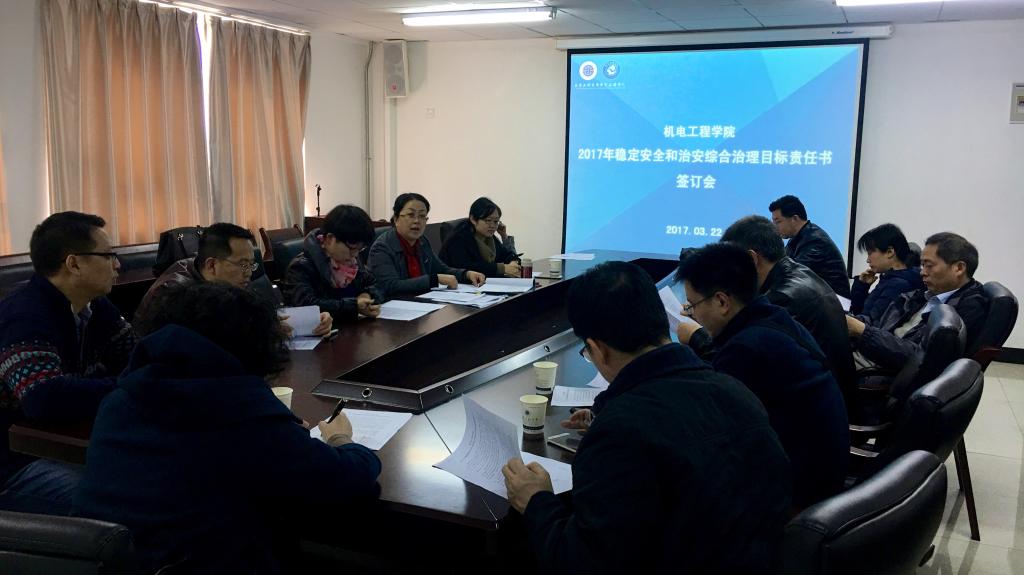 3月22日,机电学院召开2017年校园稳定安全和综合治理工作目标管理责任书签订会,部署机电学院2017年稳定安全和综合治理工作。机电学院党委书记杨永革、院长胥光申、党委副书记魏哲以及各教研室主任参加了会议,会议由杨永革主持。