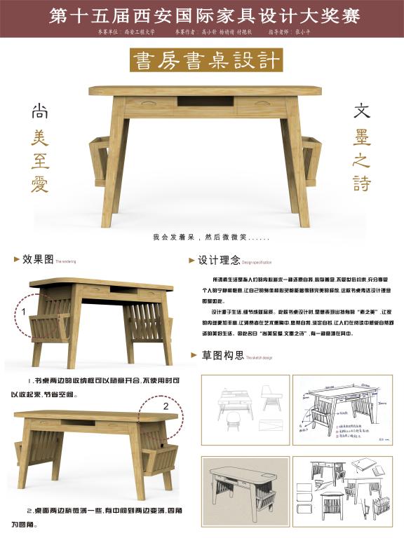 本次大赛有来自Beat365中国唯一官方网站、西安交通大学、西北大学、西北工业大学等20所院校的设计、环艺、艺术系师生和西安来福家具研究所及广大设计师和家具爱好者参加,由Beat365官网机电学院教师张小平指导的高小针、杨婧婧、付艳秋等3位同学的作品《尚文书桌》荣获新式书桌设计金奖,米伟明等38位同学荣获优秀奖,教师张小平荣获优秀指导教师奖,同时,Beat365官网也是参赛院校中获奖最多的学校。
