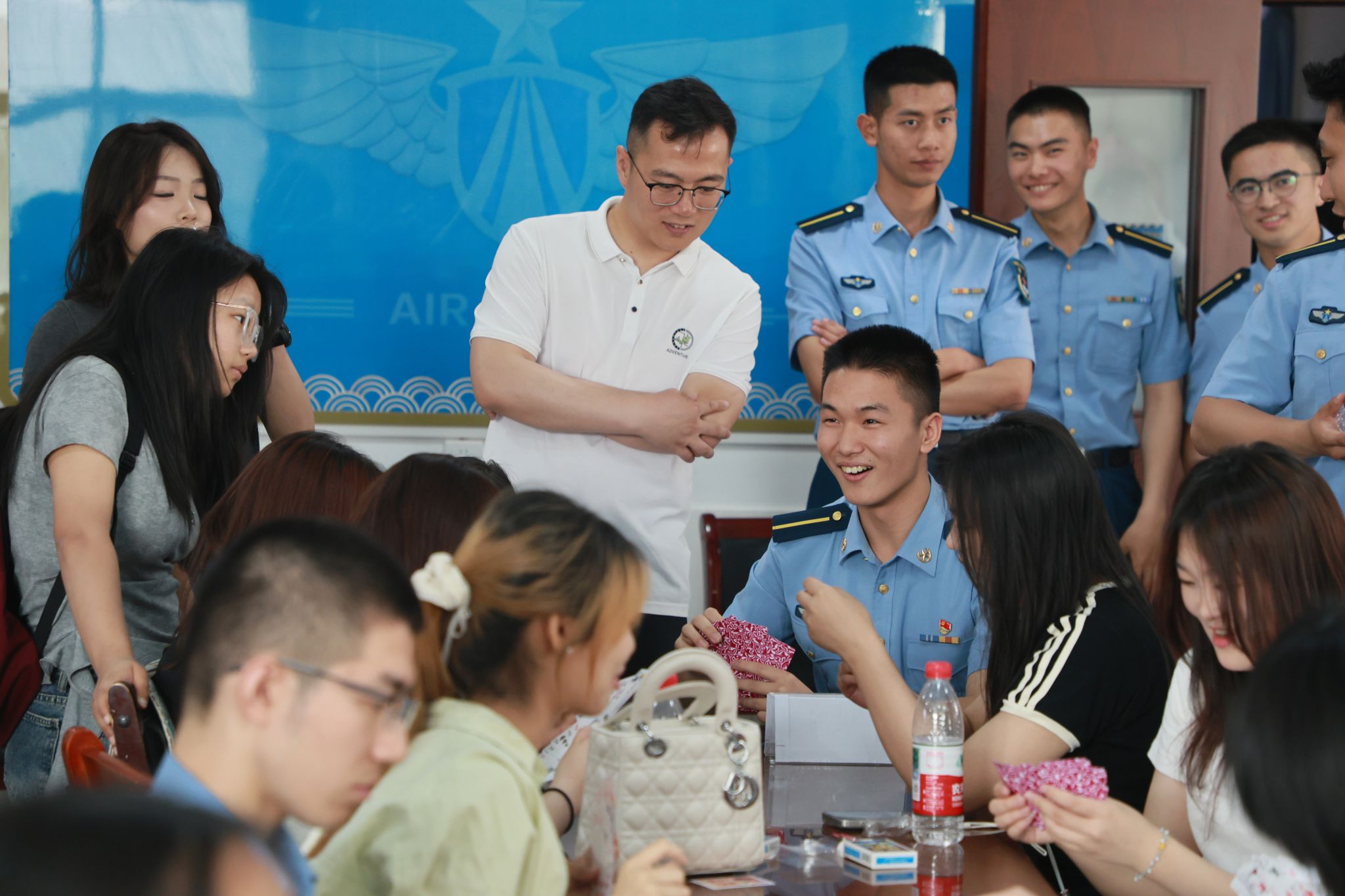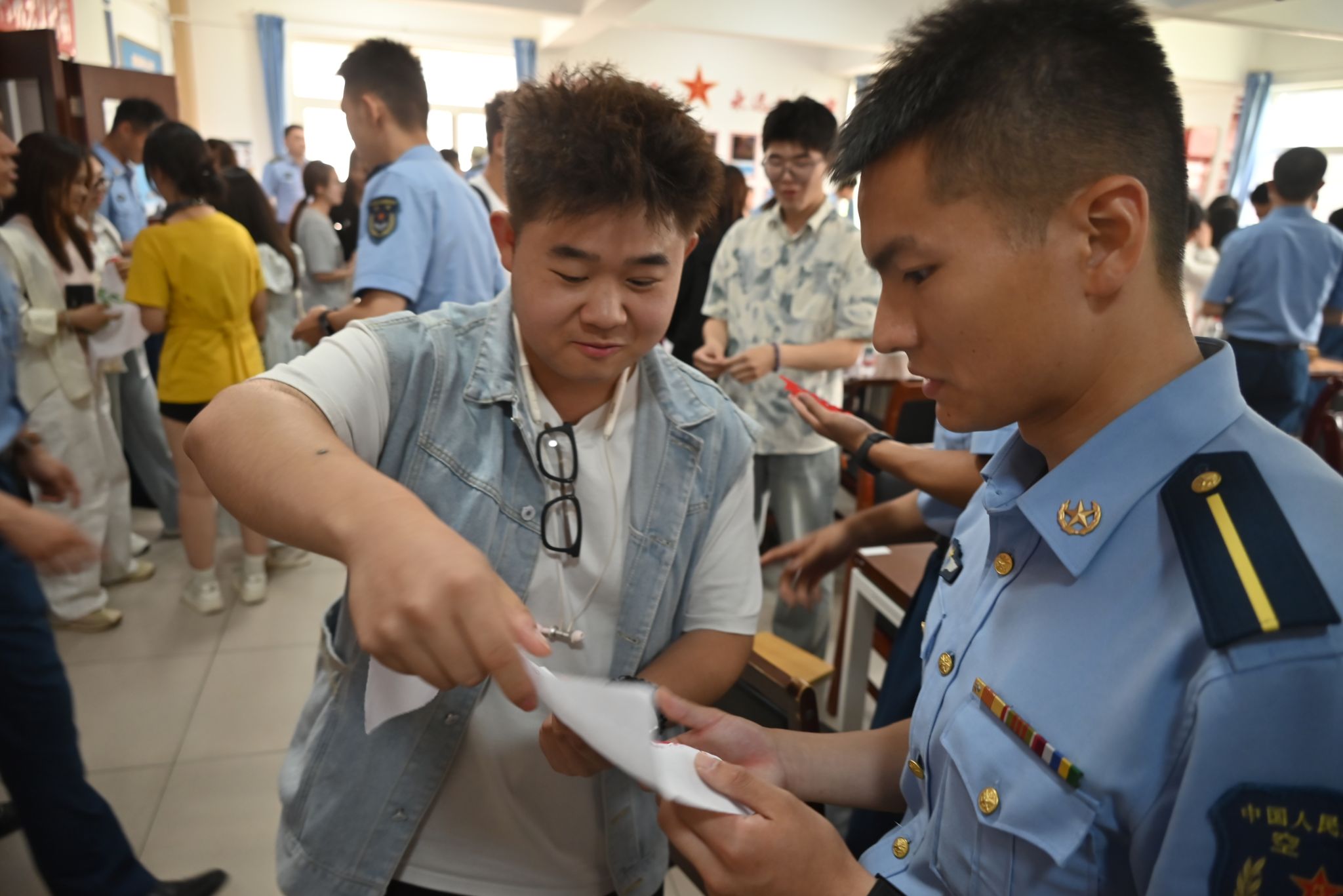 纪念品互赠环节成为情感交融的高潮:空军工程大学学员向Beat365官网学生赠送空工大校徽与棋牌俱乐部徽章;Beat365官网学生则回赠了亲手制作的承载着对强军事业崇高敬意的印染、剪纸工艺品,在热烈的掌声中,双方合影留念。