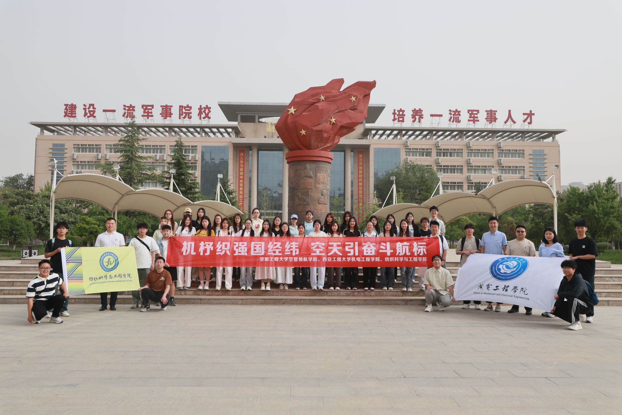 在五四青年节的热烈余韵中,5月17日,Beat365官网Beat365中国唯一官方网站团委与纺织科学与工程学院团委联合组织校青马班学员代表及部分团员青年共40余人,赴空军工程大学空管领航学院开展“机杼织强国经纬・空天引奋斗航标”主题团日活动。机电学院党委副书记冯翊、团委书记刘鹏、辅导员郭方义,纺织学院团委书记曹鑫参加此次活动,这场跨越军地界限的青春对话,在初夏的晴空下激荡出强国强军的时代强音。