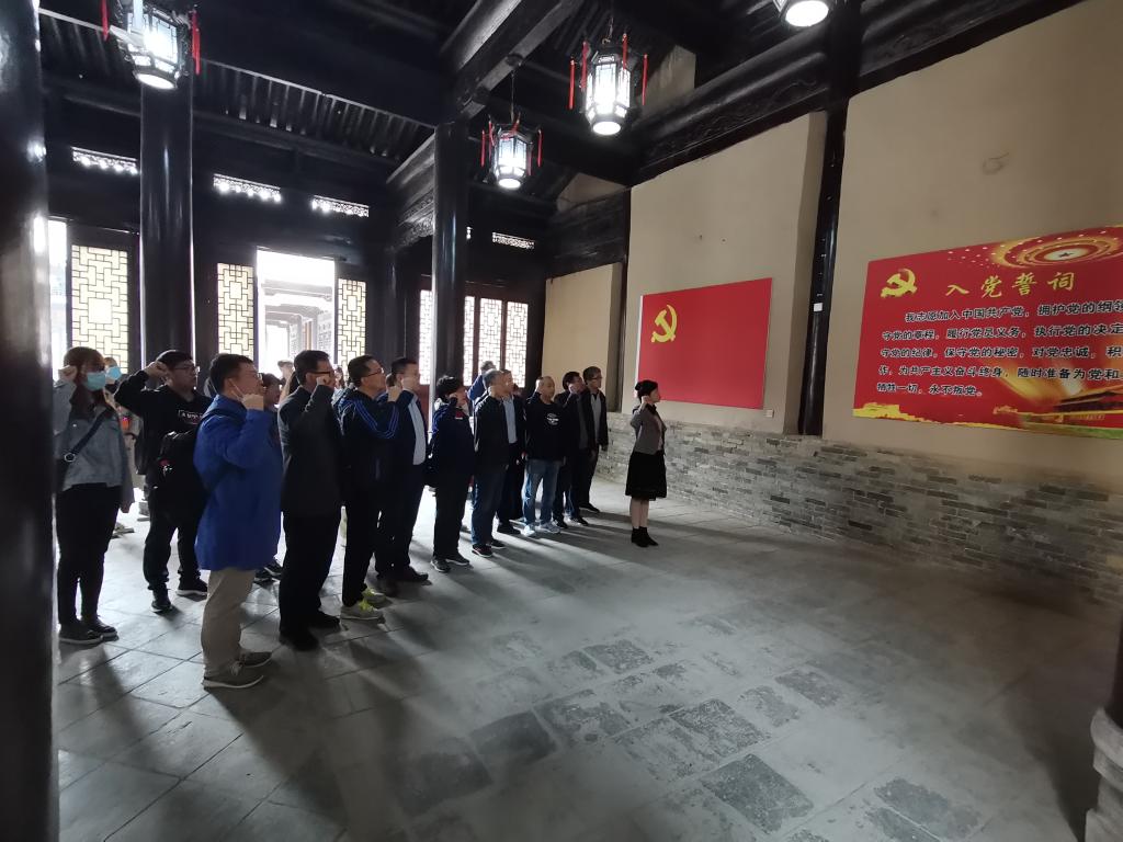 大家首先参观了安吴青年训练班纪念馆。安吴青训班是抗日战争时期中国共产党在西北领导的四大学校(抗大、鲁艺、陕公、青训班)之一,是中共中央青年工作委员会在国民党统治区泾阳县创办的一所新型战时青年干部训练学校,是我党我军在国统区创办学校的成功典范,促进了中国青年统一战线的建立,为全国抗日战争的胜利和青年运动的蓬勃发展做出了卓越的贡献。怀着追寻红色足迹、筑牢使命担当的敬意与初心,同志们聆听讲解、观看照片、实地参观,详细了解学习安吴青训班的创建背景、发展历程和革命成果,深刻缅怀胡乔木等老一辈无产阶级革命家在安吴开展革命教育活动的光辉历程与先进事迹。在六椽厅,党员们面对庄严的党旗,高举右手,再次庄重宣誓。