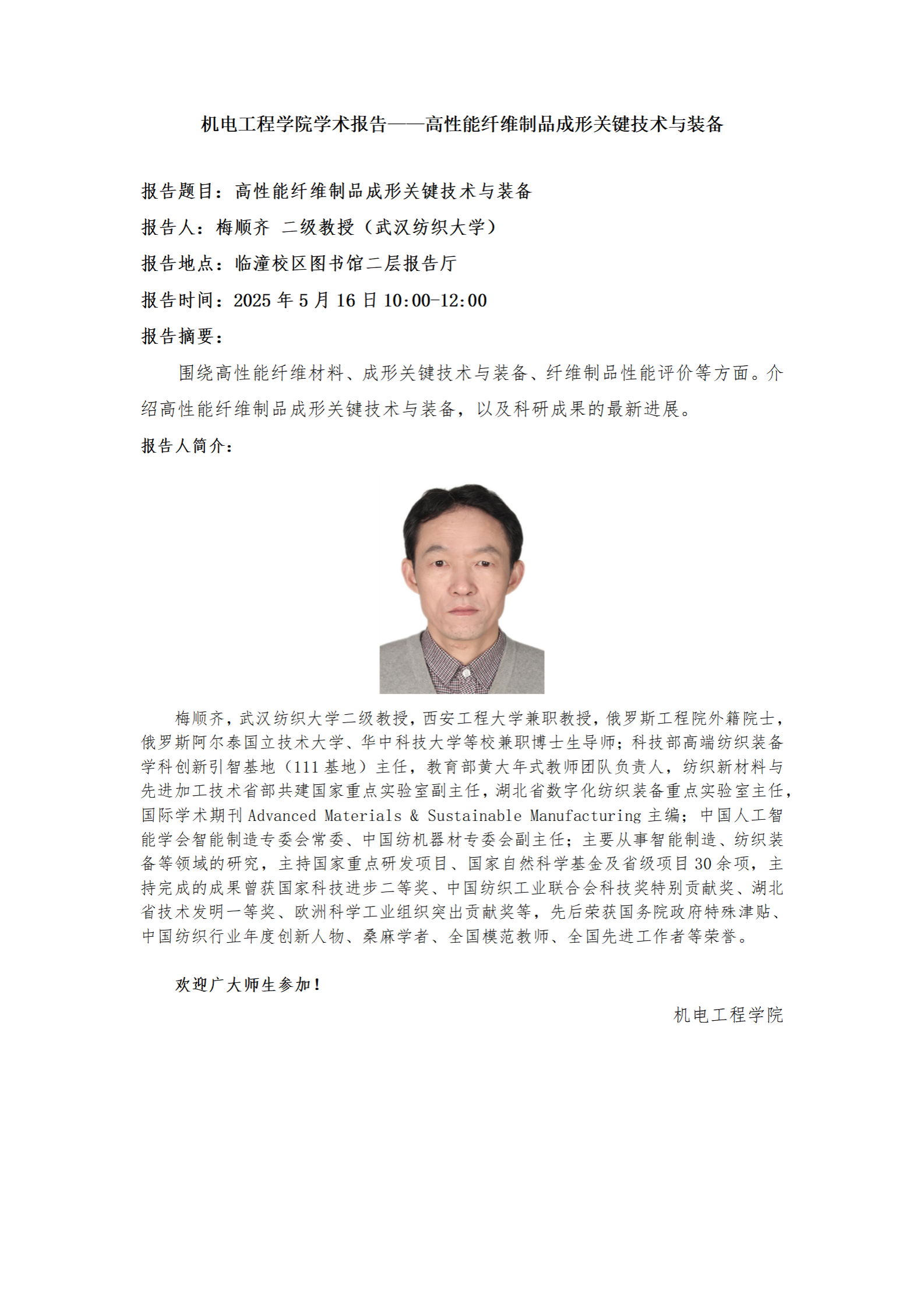 Beat365中国唯一官方网站学术报告——高性能纤维制品成形关键技术与装备